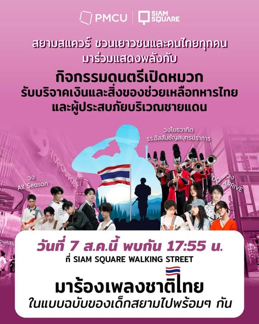 สยามสแควร์ ชวนเยาวชนและคนไทยทุกคน มาร่วมแสดงพลังกับกิจกรรมดนตรีเปิดหมวก เพื่อรับบริจาคเงินและสิ่งของช่วยเหลือทหารไทยและ ผู้ประสบภัยบริเวณชายแดน