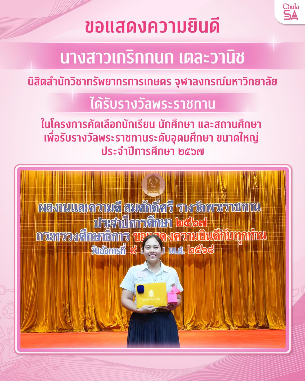 ขอแสดงความยินดี นางสาวเกริกกนก เตละวานิช นิสิตสำนักวิชาทรัพยากรการเกษตร จุฬาลงกรณ์มหาวิทยาลัย