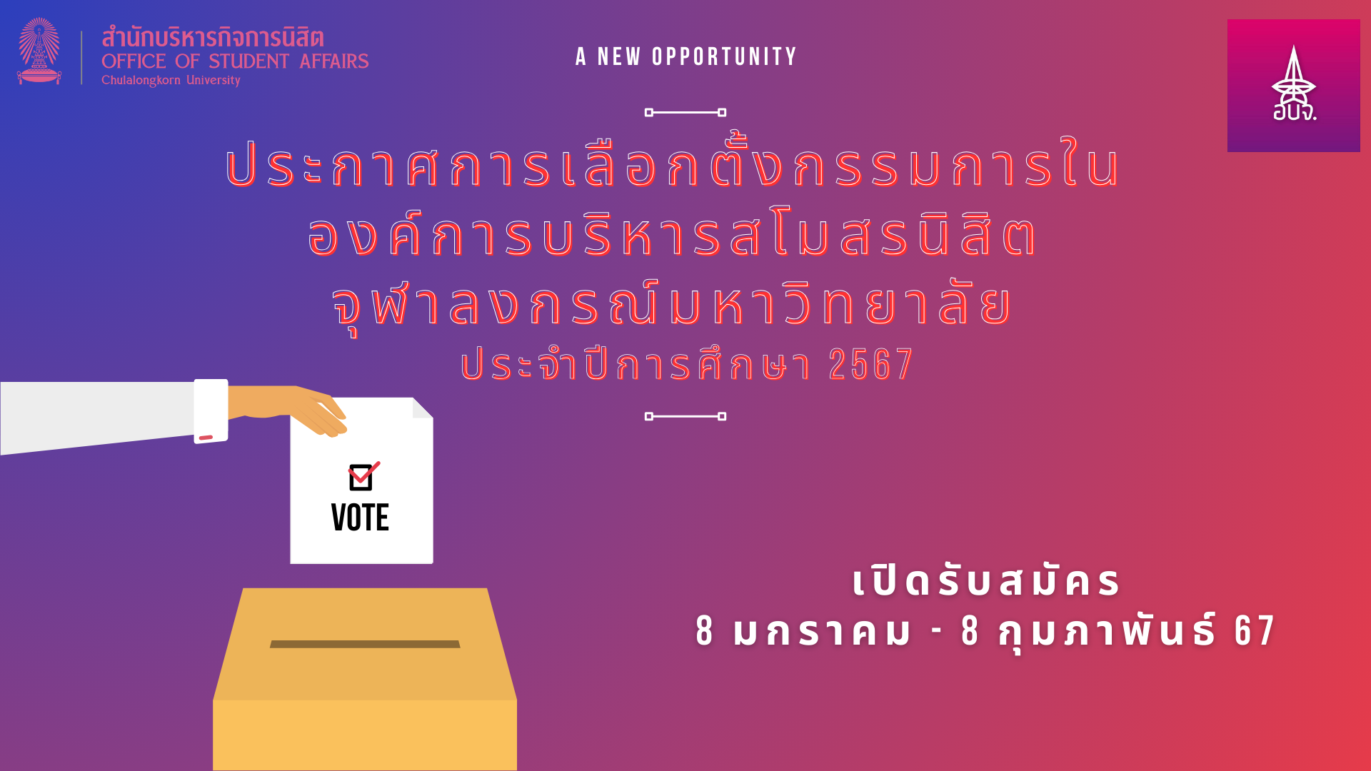 ประกาศ การเลือกตั้งกรรมการใน องค์การบริหารสโมสรนิสิต จุฬาลงกรณ์มหาวิทยาลัย ประจำปีการศึกษา 2567