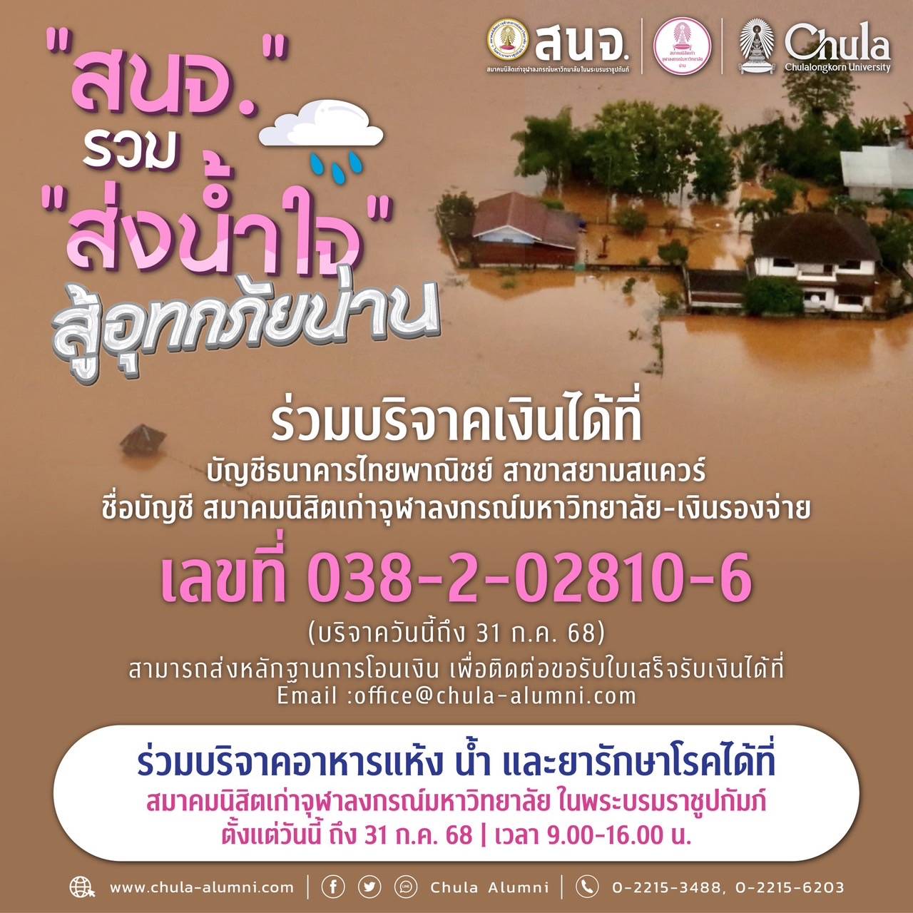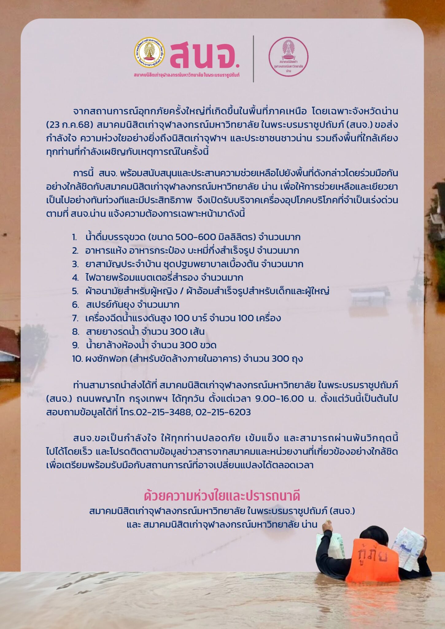 สมาคมนิสิตเก่าจุฬาลงกรณ์มหาวิทยาลัย ในพระบรมราชูปถัมภ์ (สนจ.) ชวนส่งกำลังใจให้นิสิตเก่าจุฬาฯ และประชาชนชาวน่านในอุทกภัยครั้งนี้ พร้อมเปิดรับบริจาคเงินตามกำลังศรัทธาและเครื่องอุปโภคบริโภคที่จำเป็นเร่งด่วน