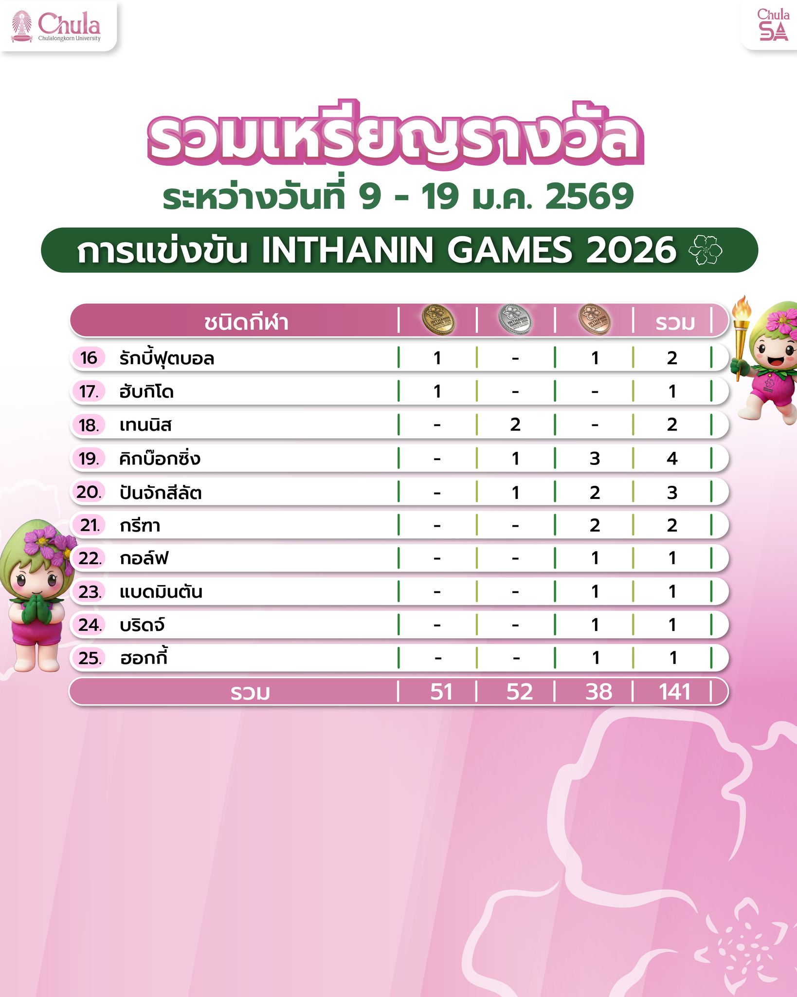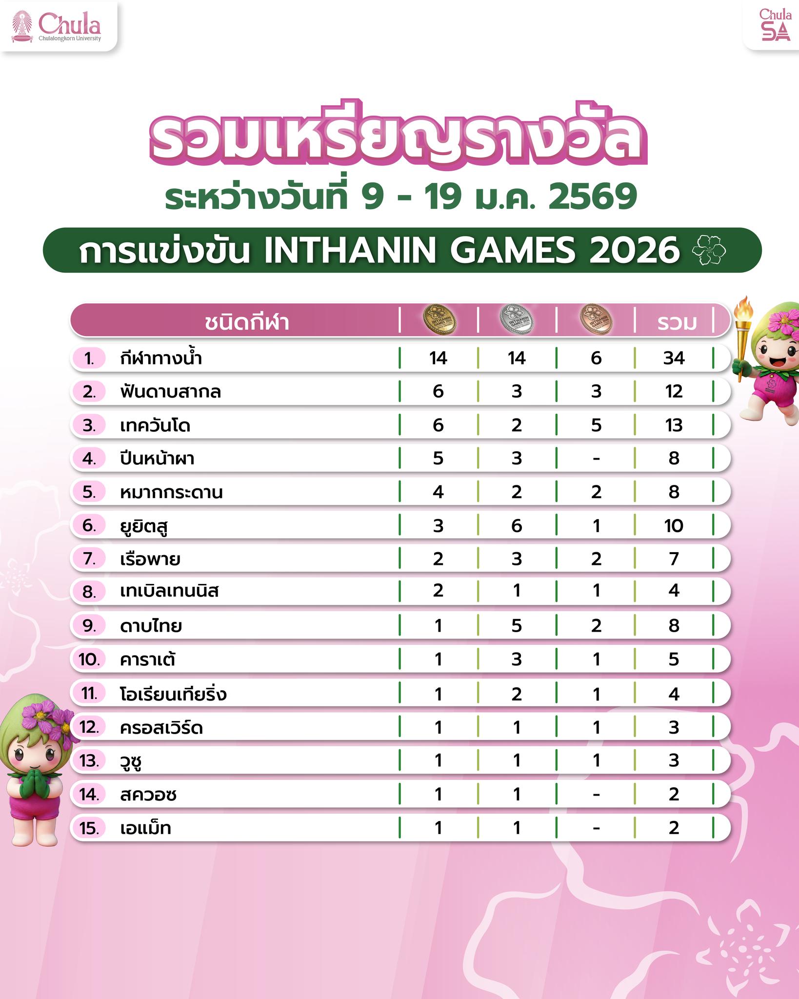 การแข่งขันเริ่มนับถอยหลังสู่บทสรุป! แต่ “ทัพนักกีฬาจุฬาฯ” ยังคงเร่งสปีดไม่มีผ่อน ยึดหัวตารางไว้อย่างเหนียวแน่น กวาดรวมไปแล้วถึง 141 เหรียญ!
