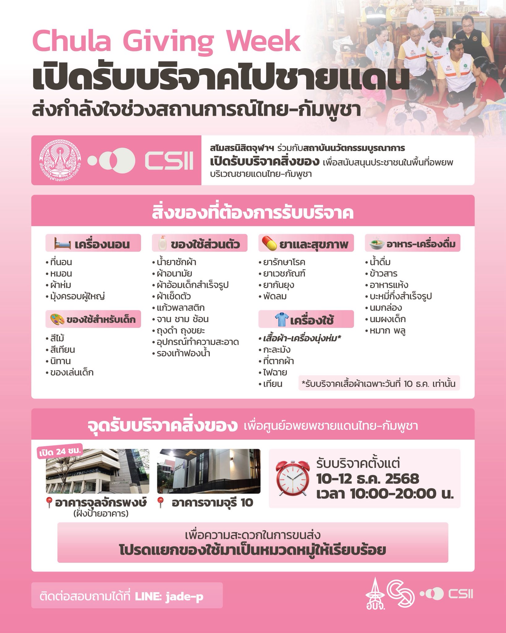 – รับบริจาคตั้งแต่ 10-12 ธันวาคม 2568 เวลา 10:00 – 20:00 น. ณ อาคารจุลจักรพงษ์ ชั้น 1
