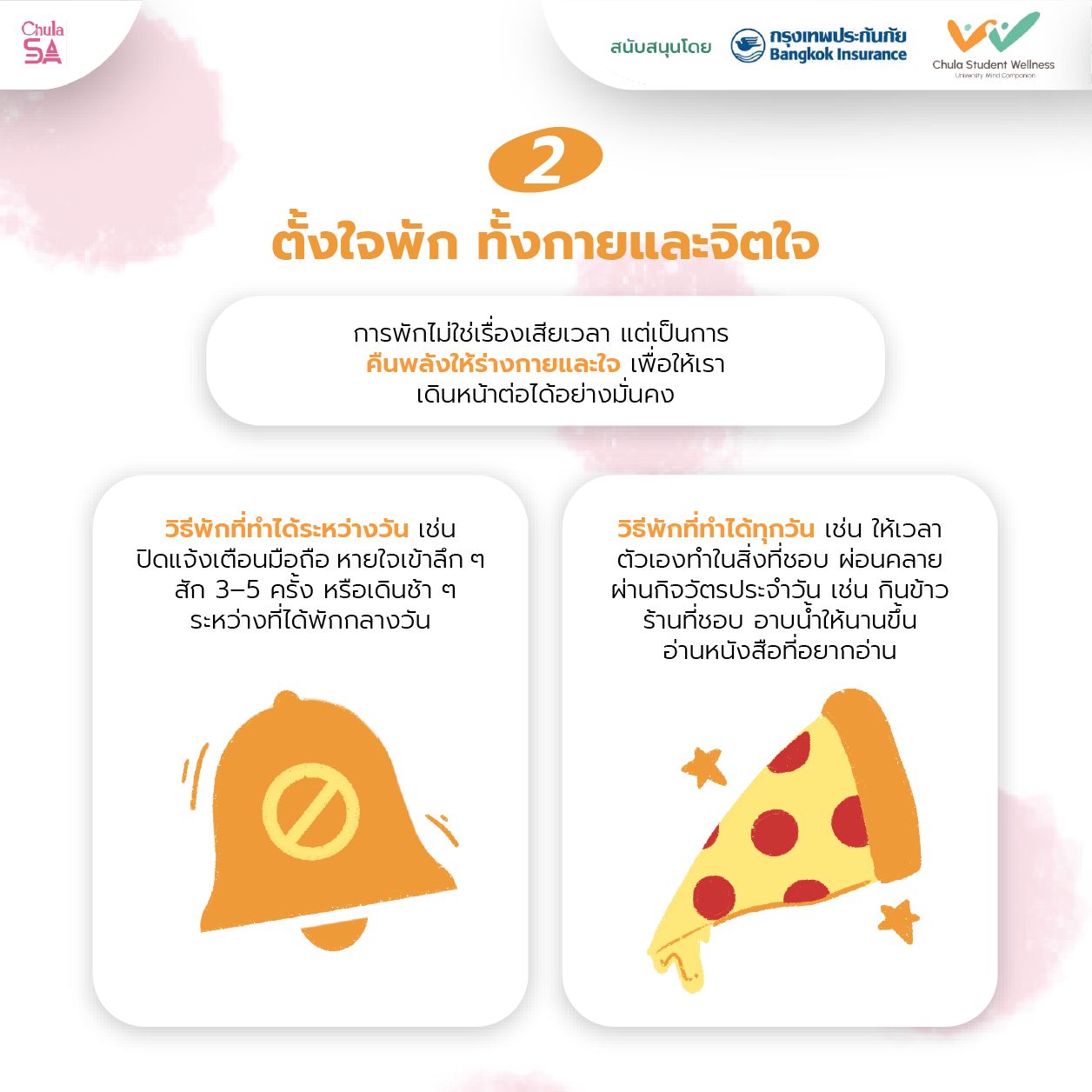 – วิธีพักที่ทำได้ทุกวัน เช่น ให้เวลาตัวเองทำในสิ่งที่ชอบ ผ่อนคลายผ่านกิจวัตรประจำวัน เช่น กินข้าวร้านที่ชอบ อาบน้ำให้นานขึ้น อ่านหนังสือที่อยากอ่าน