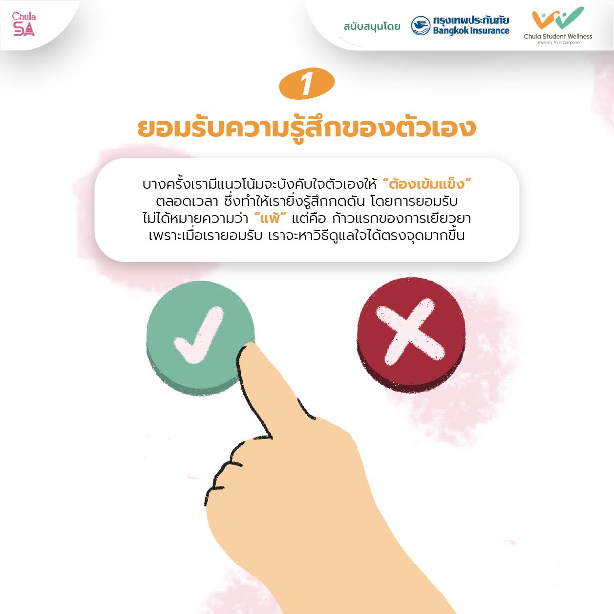 บางครั้งเรามีแนวโน้มจะบังคับใจตัวเองให้ “ต้องเข้มแข็ง” ตลอดเวลา ซึ่งทำให้เรายิ่งรู้สึกกดดัน โดยการยอมรับไม่ได้หมายความว่า “แพ้” แต่คือ ก้าวแรกของการเยียวยา เพราะเมื่อเรายอมรับ เราจะหาวิธีดูแลใจได้ตรงจุดมากขึ้น