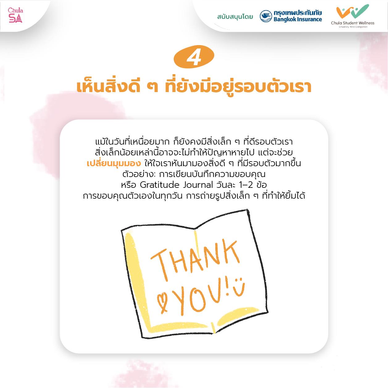 – การเขียนบันทึกความขอบคุณ หรือ Gratitude Journal วันละ 1–2 ข้อ