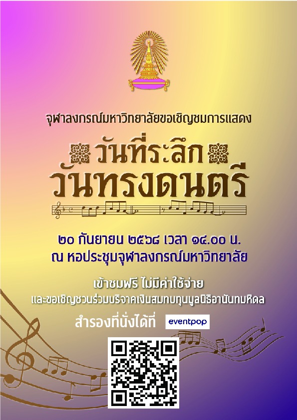จุฬาลงกรณ์มหาวิทยาลัยขอเชิญร่วมงาน “วันที่ระลึกวันทรงดนตรี” ในวันเสาร์ที่ 20 กันยายน 2568 เวลา 14.00 – 17.00 น. ณ หอประชุมจุฬาลงกรณ์มหาวิทยาลัย