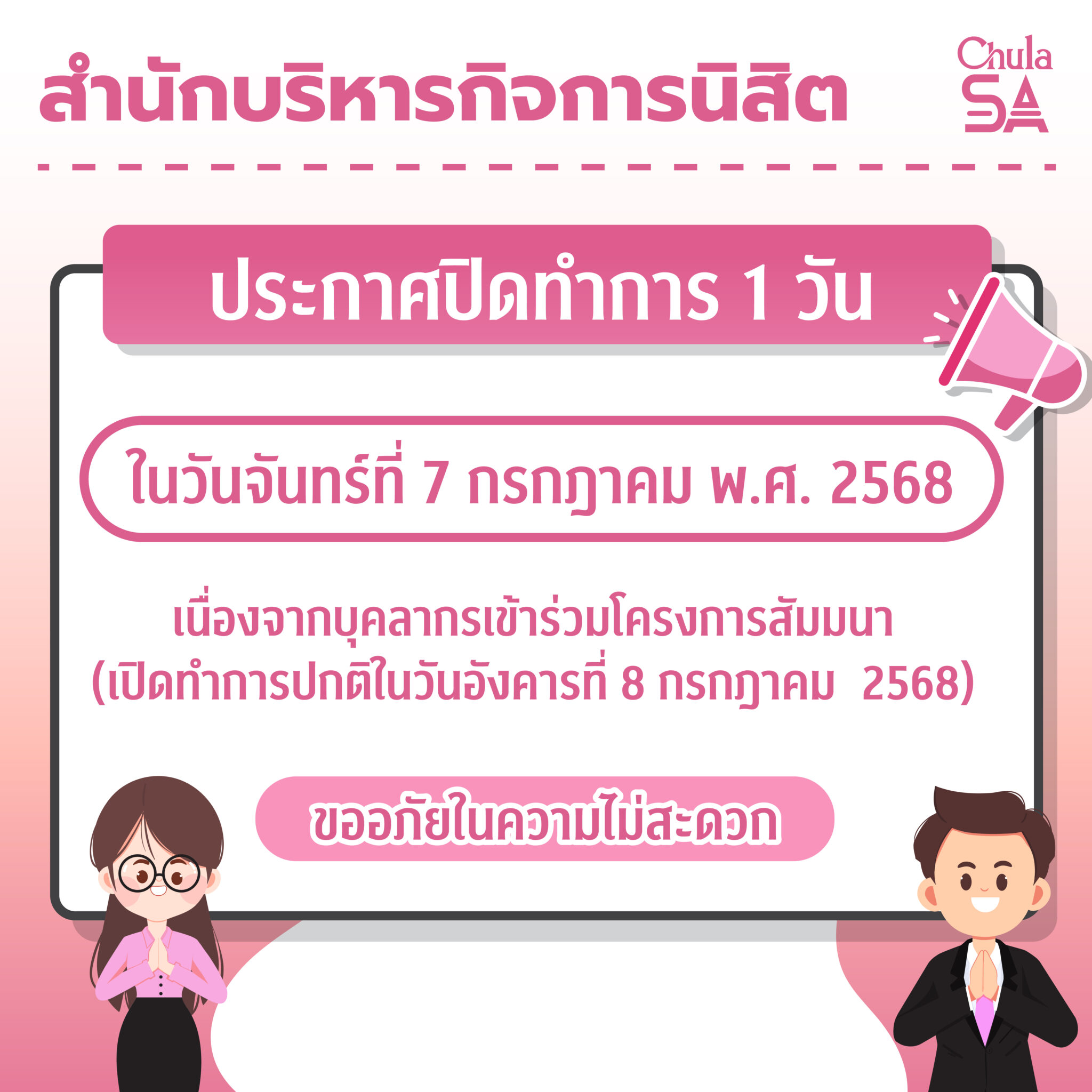 The Office of Student Affairs, Chulalongkorn University will be closed for 1 day on Monday, July 7, 2025, due to the staffs attending the seminar project “Organizational Transformation for the Digital Age (Digital Transformation)” at the Chalermkrung 60th Anniversary Building, Chulalongkorn University.