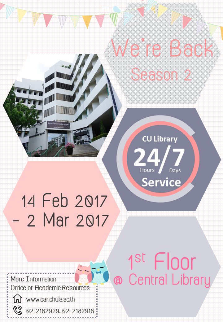 CU Library เปิดบริการ 24 ชั่วโมง ระหว่างวันที่ 14 ก.พ.- 2 มี.ค.2560