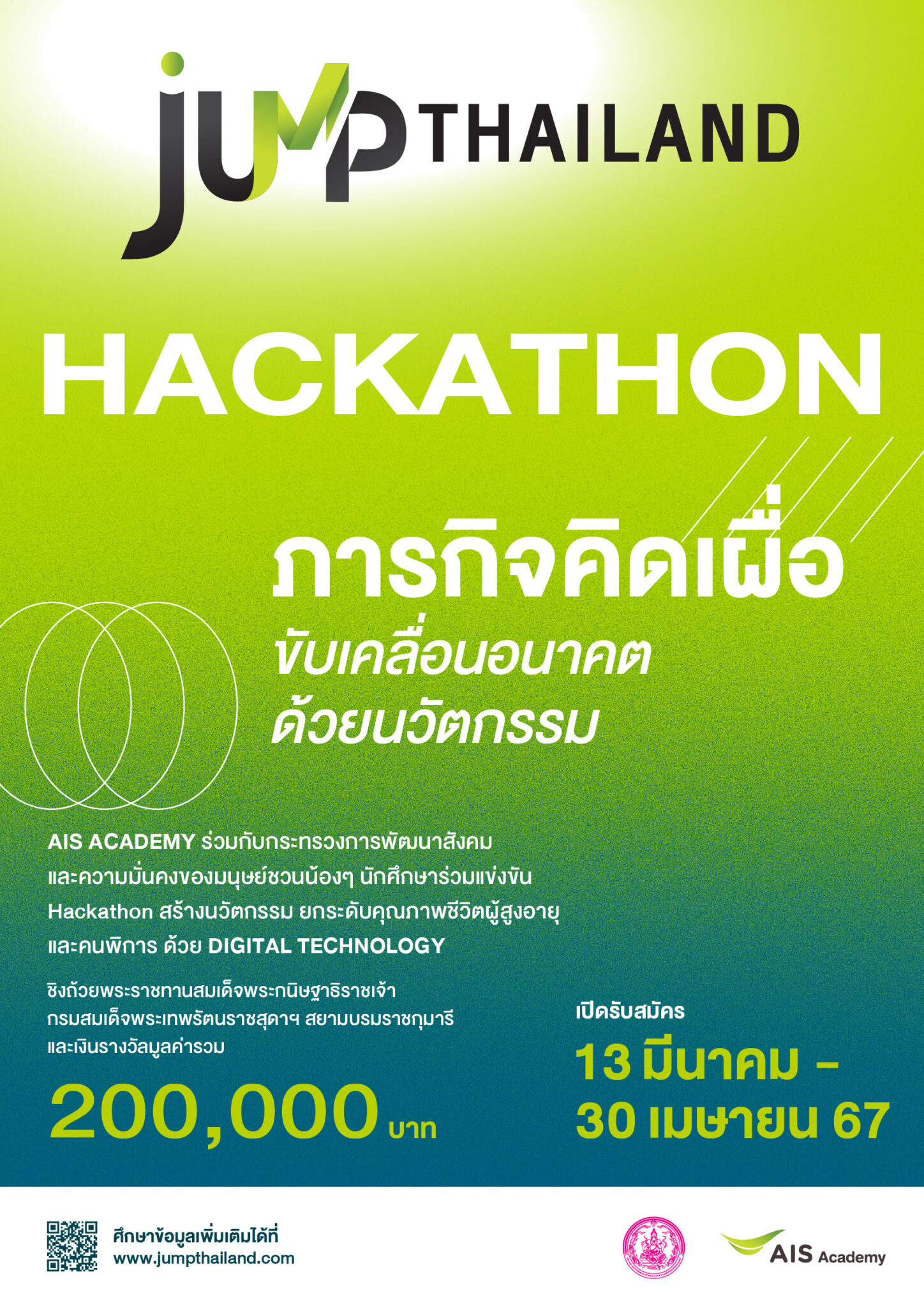 Jump Thailand เป็นการแข่งขันของนิสิต นักศึกษา จากมหาวิทยาลัยทั่วประเทศ เพื่อเปิดหาไอเดียนวัตกรรมที่จะสามารถพัฒนาเป็นเครื่องมือส่งเสริมและพัฒนาคุณภาพชีวิตและความเป็นอยู่ที่ดีของผู้สูงอายุและคนพิการ อาทิ การลดความเหลื่อมล้ำ การสนับสนุนกลุ่มผู้ด้อยโอกาสให้สามารถแสดงศักยภาพในการดูแลตนเองอย่างยั่งยืน ผ่านกระบวนการแข่งขัน Hackathon ภายใต้โจทย์ “เราจะนำเทคโนโลยีดิจิทัลมาเพิ่มคุณภาพชีวิตของผู้สูงอายุและคนพิการได้อย่างไร”
