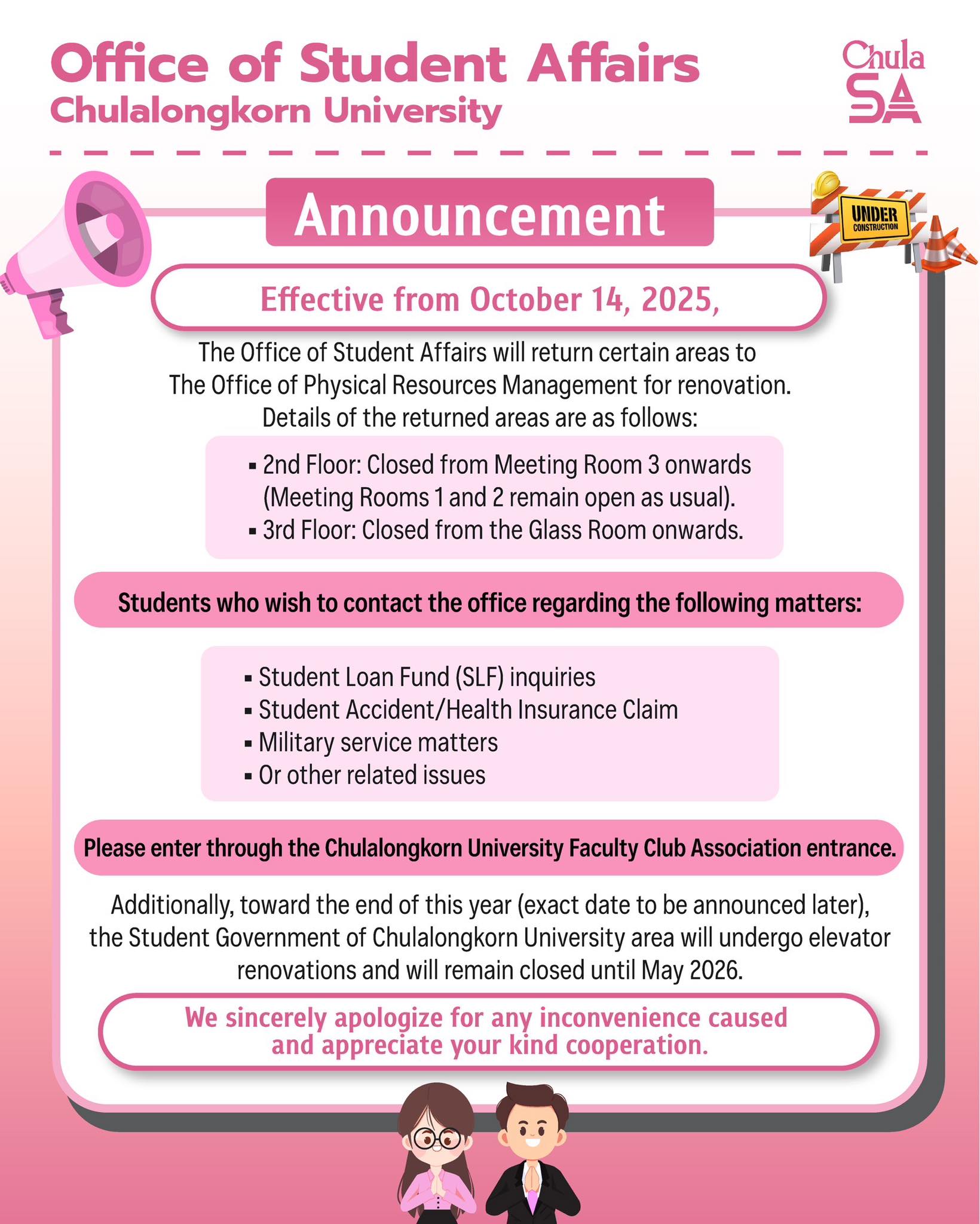 The Office of Student Affairs will return certain areas to the Office of Physical Resources Management for renovation, effective from October 14, 2025 onwards.